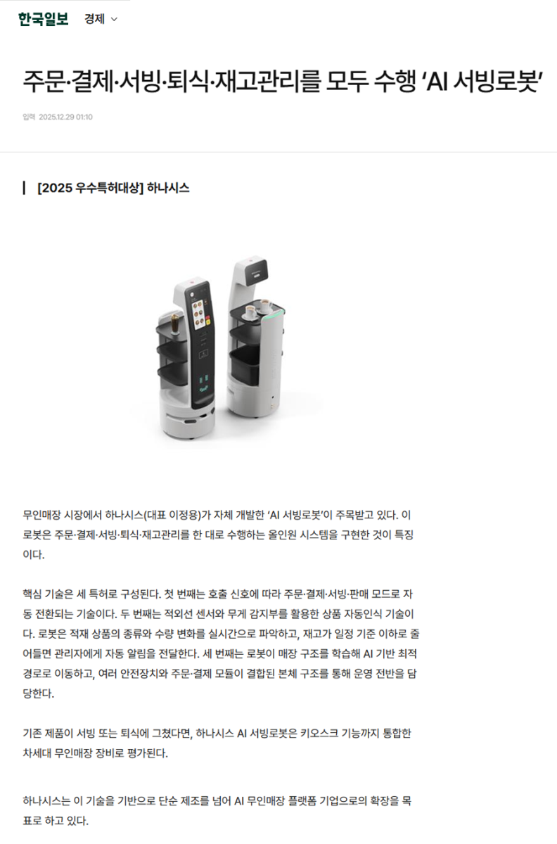 무인매장 시장에서 하나시스(대표 이정용)가 자체 개발한 ‘AI 서빙로봇’이 주목받고 있다. 이 로봇은 주문·결제·서빙·퇴식·재고관리를 한 대로 수행하는 올인원 시스템을 구현한 것이 특징이다.